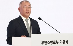 정의선 현대자동차그룹 회장이 지난달 24일 경기 남양주시 수도권119특수구조대에서 열린 현대자동차그룹·소방청 무인소방로봇 기증식에서 인사말을 하고 있다. 뉴스1 정의선 현대차그룹 회장이 지난해 기아에서 총 54억원의 보수를 받은 것으로 나타났다. 12일 기아…