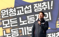 양경수 민주노총 위원장이 10일 서울 종로구 세종대로 일대에서 열린 민주노총 투쟁 선포대회에서 대회사를 하고 있다. 뉴스1 노란봉투법 시행 여파가 전방위로 확산하고 있다. 원청 사업장에 교섭을 요구한 하청노조 수는 이틀 새 450개를 돌파했다. 노란봉투법…