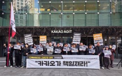 12일 오후 경기도 성남시 판교 카카오아지트 앞에서 카카오노조(크루유니온)가 '디케이테크인 고용 안정 쟁취' 기자회견을 열고 있다. 서지원 기자 판교 정보기술(IT) 업계가 ‘노동조합 및 노동관계조정법 2·3조 개정안’(이하 노란봉투법) 시행에 따른 후폭…
