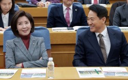 국민의힘 나경원 의원이 6일 국회 의원회관에서 국민의힘 권영세 의원과 서울시가 연 용산국제업무지구 관련 정책 토론회에 참석해 오세훈 서울시장과 대화하고 있다. 연합뉴스 한동훈 “허위사실…정정·사과 요청” 나경원 국민의힘 의원이 당내 갈등과 관련해 “정당 흔들기가…