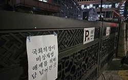 윤석열 대통령에 대한 탄핵소추안이 가결된 지난해 12월 14일 서울 여의도 국회 담장에 '12·3 비상계엄 사태' 당시 우원식 국회의장 등이 국회 진입을 위해 넘었던 담장을 표시한 문구가 붙어 있다. 연합뉴스 우원식 국회의장이 다음 달 3일 비상계엄 해제 1주년을…
