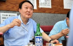 2021년 당시 야권 대권주자이던 윤석열 전 대통령이 부산 서구의 한 식당을 방문, 지역 국회의원들과 함께 소주를 곁들이며 식사하고 있다. 송봉근 기자 윤석열 전 대통령이 각 부처 장관들과 함께 술을 마시기 위해 일부러 업무 보고 시간을 오후 늦게 잡았다…