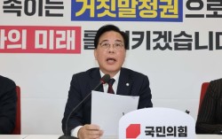 장동혁 국민의힘 대표(가운데)가 17일 ‘대장동 항소포기 외압 진상규명 국정조사 촉구 기자회견’에서 발언하고 있다. 뉴스1 지난 8일 대장동 항소 포기 사태가 불거지자 국민의힘은 “이재명 대통령은 탄핵감” “제2의 드루킹 사태” 등을 주장하며 대대적인 공…