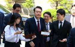 윤석열 전 대통령이 12일 오전 내란 및 직권남용 혐의 사건 재판에 출석하기 위해 서울 서초구 중앙지방법원에 도착해 취재진의 질문을 받으며 이동하고 있다. 윤 전 대통령은 이날 처음으로 법원 지상으로 출석했지만, 포토라인에 멈춰 서지 않고 말없이 법원 청사로 들어갔다.…