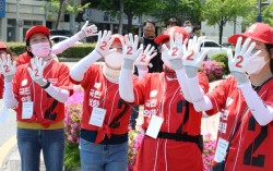 더불어민주당 울산시당 선거운동원들이 12일 오전 울산시 남구 공업탑 앞에서 출정식을 마친 뒤 이재명 후보 지지를 호소하고 있다. [뉴시스] “잘될 것 같습니다! 이번엔 패배하고 우는 일이 없을 것 같습니다!” 6·3 대선 공식 선거운동이 시작된 12…