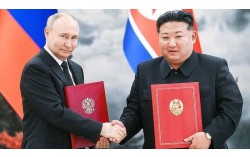 푸틴 러시아 대통령과 김정은 북한 국무위원장이 지난해 6월 평양에서 정상회담 뒤 서명한 조약을 들어 보이고 있다. 연합뉴스 크렘린궁은 가까운 시일 내에 김정은 북한 국무위원장의 러시아 방문이나 블라디미르 푸틴 러시아 대통령의 북한 방문이 계획돼 있지 않다…