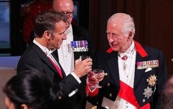 지난 8일(현지시간) 영국 윈저성에서 열린 국빈 만찬에 참석한 에마뉘엘 마크롱(왼쪽) 프랑스 대통령이 찰스 3세 영국 국왕과 대화를 나누고 있다. 로이터=연합뉴스 에마뉘엘 마크롱 프랑스 대통령이 영국을 국빈 방문해 프랑스어로 연설했다가 현지 보수 매체로부터 "무례…