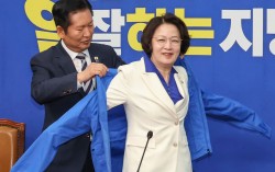 정청래 더불어민주당 대표가 13일 국회에서 최고위원회의에 앞서 열린 추미애 경기도 지사 후보 환영식에서 추 후보에게 선거용 점퍼를 입혀주고 있다. 연합뉴스 정청래 더불어민주당 대표가 13일 이재명 대통령의 이스라엘 관련 논란과 관련해 이 대통령의 입장을 공개 지지…