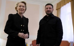 볼로디미르 젤렌스키 우크라이나 대통령이 26일(현지시간) 이탈리아 로마에서 우르줄라 폰데어라이엔 EU 집행위원장과 양자회담하고 있다. AFP=연합뉴스 볼로디미르 젤렌스키 우크라이나 대통령이 러시아의 사흘 휴전 일방선언을 모종의 공작으로 의심했다. AFP 통신…
