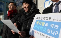 고(故) 이대준씨의 형 이래진씨가 7일 과천시 정부과천청사 앞에서 검찰의 일부 항소와 관련해 김민석 국무총리와 박철우 서울중앙지검장을 직권남용 권리행사 방해혐의로 고위공직자범죄수사처에 고발한다고 밝히고 있다. 연합뉴스 서해 공무원 피격 사건 유족이 7일…
