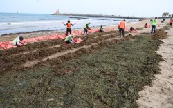 지난 16일 오전 제주시 이호해수욕장에 미역이 대량으로 파도에 떠밀려와 제주시 바다환경지킴이가 수거작업을 하고 있다. 연합뉴스 제주를 대표하는 해수욕장 가운데 하나인 제주시 이호해수욕장에서 때아닌 미역과의 전쟁을 벌이고 있다. 이 해수욕장에는 지난 16일에 …