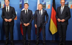 마크 뤼터 나토 사무총장, 에마뉘엘 마크롱 프랑스 대통령, 도날트 투스크 폴란드 대통령, 프리드리히 메르츠 독일 총리가 25일 네덜란드 헤이그에서 열린 나토 정상회의 행사에 참석하고 있다. 로이터=연합뉴스 북대서양조약기구(NATO·나토) 32개국이 도널드…