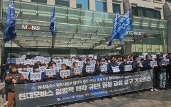 10일 오전 서울 강남구 현대모비스 본사 앞에서 금속노조·하청노조(생산 전문 자회사 모트라스·유니투스) 등은 기자회견을 열고 현대모비스의 램프사업부 매각에 대해 원청 측의 교섭을 요구했다. 고석현 기자 껍데기뿐이 아니라 실질적 결정권을 쥐고 있는 진짜 사장 ‘현대모비…