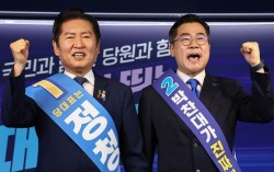 정청래 후보와 박찬대 후보가 19일 서울 여의도 더불어민주당 중앙당사에서 열린 '당대표 및 최고위원 선출을 위한 충청권 합동연설회'에서 기념촬영을 하고 있다. 뉴스1 더불어민주당이 다음 달 2일 전당대회에서 서울·강원·제주뿐만 아니라 호남권과 경기·인천 순회 경선…