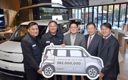 지난 11일 서울 압구정에 위치한 브랜드 체험관인 'Kia360'에서 열린 '2025년 사랑나누기' 기부 캠페인에서 참석자들이 차량 및 장학금 전달 기념 촬영을 하고 있다. 왼쪽부터 엄태일 기아 판매지회장, 문은주 기아 정비지회장, 기아 국내사업지원담당 최진기 전무…