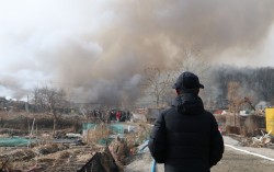 16일 서울 강남구 개포동 구룡마을 4지구 화재현장 소방 통제선 밖에서 주민이 현장을 지켜보고 있다. 연합뉴스 16일 오전 5시쯤 서울 강남구 개포동 구룡마을에서 발생한 대형 화재의 불길이 약 6시간 30분 만에 잡혔다. 소방 당국은 이날 오전 11시 34분…