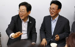 이재명 대통령이 8일 서울 용산 대통령실 청사 매점에서 출입기자단과 예정에 없던 티타임을 가지고 있다. 오른쪽은 김민석 국무총리. 김현동 기자 이재명 대통령이 11일 경주에서 개최되는 아시아태평양경제협력체(APEC) 정상회의와 관련해 김민석 국무총리에게 …