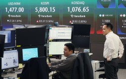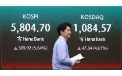 코스피가 전 거래일(5494.78)보다 309.92포인트(5.64%) 상승한 5804.70에 개장한 8일 오전 서울 중구 하나은행 딜링룸에 지수가 표시돼 있다. 코스닥 지수는 전 거래일(1036.73)보다 47.84포인트(4.61%) 오른 1084.57에 거래를 시작했…