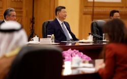 14일 시진핑 중국 국가주석이 인민대회당에서 칼리드 빈 모하메드 알 나얀 아랍에미리트(UAE) 아부다비 왕세자와 만나 발언하고 있다. 로이터=연합뉴스 14일 시진핑 중국 국가주석이 최근의 중동 정세와 관련해 평화공존, 국가 주권, 국제법치, 발전과 안보…