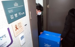경찰이 공천헌금 수수 등 각종 비위 의혹에 휩싸인 더불어민주당 김병기 의원의 주거지 등에 대한 압수수색에 착수한 지난 14일 국회의원회관 내 김 의원 사무실에서 경찰이 압수품을 옮기고 있다. 연합뉴스 경찰이 더불어민주당 김병기 의원 차남의 숭실대학교 특혜 편입 의…