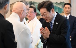 이재명 대통령이 9일 용산 대통령실에서 오찬에 참석한 조계종 총무원장 진우스님과 인사하고 있다. 대통령실사진기자단 이재명 대통령은 9일 대통령실 누리홀에서 종교계 지도자들과 오찬을 했다. 이 대통령은 이날 오찬에서 “(대통령)선거 과정에서 걱정했던 …