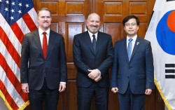 여한구 산업통상자원부 통상교섭본부장이 23일(현지시간) 미국 워싱턴 D.C 상무부 회의실에서 하워드 러트닉 미국 상무부 장관과 제이미슨 그리어 미국 무역대표부 대표와 면담 후 기념 촬영을 하고 있다. (산업통상자원부 제공. 재판매 및 DB 금지) 2025.6.24/뉴스…