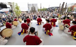 지난 22일, 일본 오사카에서 진행 중인 ‘2025 오사카엑스포’ 야외 팝업스테이지에서 크라운해태제과 임직원들이 ‘사물놀이 삼도농악가락’을 공연하고 있다. 사진 크라운해태제과 전 세계 158개국이 참여하는 ‘일본 오사카·간사이 만국박람회(2025 오사카 엑스포)'…