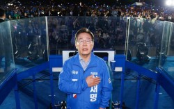 이재명 대통령 당선인이 4일 서울 여의도 국회 앞에 마련된 더불어민주당의 국민개표방송시청 현장에서 지지자들에게 감사 인사를 하고있다. 김성룡 기자 이재명 더불어민주당 후보가 제21대 대선에서 당선이 확정되자 주요 외신들은 이 소식을 일제히 긴급 뉴스로 타…