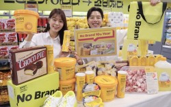 노브랜드 매장에서 모델이 10주년 기념 할인 행사 제품을 선보이고 있다. [사진 이마트] 생수 4억 병, 우유 1억1500만개, 감자칩 6000만개, 닭꼬치 1200만개…. 이마트의 자체 브랜드(PB)인 ‘노브랜드’의 주요 인기상품의 누적 판매량이다…