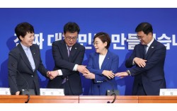 여야 정책위의장과 정책위수석부의장이 7일 오전 국회에서 열린 여야 정책위의장 상견례에서 손을 맞잡고 기념촬영을 하고 있다. 왼쪽부터 국민의힘 김은혜 원내정책수석부대표 겸 정책위 수석부의장, 진성준 더불어민주당 정책위의장, 김정재 국민의힘 정책위의장, 이정문 더불어민주당…