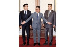 강훈식 대통령비서실장, 김민석 총리, 김병기 더불어민주당 원내대표(왼쪽부터)가 6일 총리공관에서 열린 고위당정회의에 앞서 기념촬영을 하고 있다.