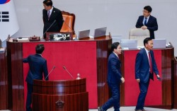 문진석 더불어민주당 원내수석부대표(의장석 앞 왼쪽부터), 송언석 국민의힘 비상대책위원장 겸 원내대표, 유상범 원내수석부대표가 4일 오후 서울 여의도 국회에서 제426회국회(임시회) 제5차 본회의 개의 지연 관련 우원식 의장과 대화한 뒤 자리로 향하는 모습. 뉴스1 …