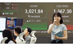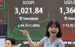 코스피 종가가 3,000선을 돌파한 20일 서울 중구 하나은행 딜링룸에서 딜러들이 업무를 보고 있다.연합뉴스 코스피가 5거래일 연속 올라 3년 6개월 만인 20일 3000선 위에서 장을 마쳤다. 이날 코스피는 전일보다 44.10포인트(1.48%) 오…