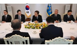 이재명 대통령이 지난 13일 서울 용산 대통령실 청사에서 열린 6경제단체와 기업인 간담회에서 이재용 삼성전자 회장의 발언을 듣고 있다. 뒷줄 왼쪽부터 구광모 LG그룹 회장, 이 삼성전자 회장, 이 대통령, 정의선 현대자동차그룹 회장, 신동빈 롯데그룹 회장. 대통령실사진…