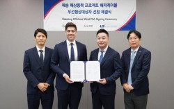 17일 LS용산타워에서 ‘해송 해상풍력 프로젝트’ 해저케이블 우선협상공급합의서(PSA) 체결식이 열렸다. 왼쪽부터 권지안 ㈜해송해상풍력발전 공급망전략담당(상무)과 조나단 스핑크 COP코리아 대표, 박승기 LS전선 에너지국내영업부문장(상무), 이성우 LS전선 에너지국내영…