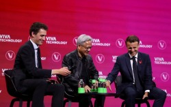 양자컴 끌어안기 행보 아르튀르 멘쉬 미스트랄 최고경영자(왼쪽), 젠슨 황 엔비디아 최고경영자(가운데), 에마뉘엘 마크롱 프랑스 대통령이 11일(현지시간) 프랑스 파리에서 열린 ‘비바테크놀로지’ 콘퍼런스에서 토론하고 있다. 이날 엔비디아의 개발자 컨퍼런스인 ‘GTC 파…