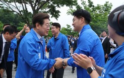 지난해 6월 2일 이재명 더불어민주당 대선 후보가 서울 북서울꿈의숲 서문광장에서 유세를 하기 전 박용진 전 의원과 인사를 하고 있다. 뉴시스 박용진 대통령 직속 규제합리화위원회 부위원장(총리급)이 4일 "나는 '비명'이 아닌 이재명 정부의 사람"이라며 국정 운영에…