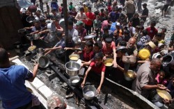 19일(현지시간) 가자지구 북부 자발리아에서 주민들이 식량 지원을 받기 위해 모여 있다. AFP=연합뉴스 영국·프랑스·캐나다 정상이 이스라엘에 "가자지구에서 군사행동을 중단하지 않으면 제재를 가할 수 있다"고 경고했다. 로이터통신에 따르면 19일(현…