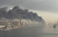 2일 우리 선원이 직접 촬영한 호르무즈해협 인접 아랍에미리트(UAE) 제벨알리항에서 연기가 피어오르고 있다. [사진 선원노련] 중동 정세가 불안해지자 가전·식품 등 대(對)중동 사업을 전개해 왔던 국내 산업계의 긴장감이 높아지고 있다. 2일 업계에 …