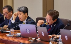이재명 대통령(오른쪽)이 지난 5일 용산 대통령실에서 주재한 첫 국무회의 도중 점심으로 김밥을 먹고 있다. 이날 회의에는 조태열 외교부 장관(왼쪽), 이주호 국무총리 직무대행 겸 부총리 등 윤석열 정부 때 임명된 국무위원들이 다수 참석했다. 사진 대통령실 …