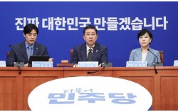 김병기 더불어민주당 당대표 직무대행 겸 원내대표(가운데)가 지난 16일 오전 국회에서 열린 최고위원회의에서 발언하고 있다. 임현동 기자 [속보] 민주, '당대표 선출' 전당대회 8월 2일 개최