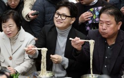 한동훈 전 국민의힘 대표가 지난달 27일 오후 대구 중구 서문시장 국수골목을 찾아 점심으로 국수를 먹고 있다. 뉴스1 한동훈 전 대표가 국민의힘 제명 이후 대구를 찾은 데 이어 이번 주에는 부산을 방문한다. 한 전 대표는 2일 페이스북을 통해 “이번 토요일(…