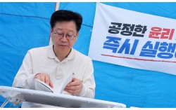 전북지사 경선에서 낙마한 안호영 더불어민주당 의원이 12일 서울 여의도 국회 본청 앞에서 이원택 전북지사 후보의 '주류·식사비 대납' 의혹에 대한 재감찰을 요구하며 단식 투쟁을 하고 있다. 뉴스1 이원택 의원이 6·3 지방선거 더불어민주당 전북지사 후보로 확정됐지…