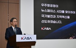 21일 오후 우주항공청에서 개최된 개청 1주년 기자간담회에서 윤영빈 우주항공청장이 발언하고 있다. 사진 우주항공청 ‘2032년 달 착륙에 이어 2045년 화성 착륙’. 1년 전 우주항공청이 내놓은 우주 탐사 목표다. 오는 27일 개청 1주년을 맞는 우주청은 이런 …