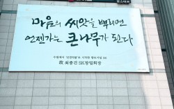 수원역 AK플라자 외벽에 게시한 2026 수원희망글판에 쓰인 최종건 SK그룹 창업회장 어록. 사진 수원특례시 “마음의 씨앗을 뿌리면 언젠가는 큰 나무가 된다.” 수원역 인근 대형 간판에 쓰인 이 문장은 SK그룹 창업주인 고(故) 최종건 회장의 어록이…
