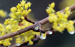 단비가 내린 27일 부산 남구 대연수목전시원에 산수유꽃이 활짝 핀 가운데 나뭇가지에 물방울이 맺혀있다. 기상청은 토요일인 28일 전국이 대체로 포근한 날씨가 이어지겠다고 예보했다. 아침 최저기온 -4∼6도, 낮 최고기온 8∼17도로 예상했다. 당분간 기온은 평년보다 높…