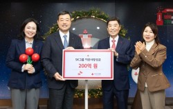지동섭 SK수펙스추구협의회 SV위원장이 16일 서울 중구 정동 사회복지공동모금회를 찾아 200억원 성금을 전달했다. 왼쪽부터 김은정 SK수펙스추구협의회 SV위원회 부사장, 지 위원장, 김병준 사회복지공동모금회 회장, 김경희 사회복지공동모금회 사회공헌본부 본부장. 사진 …