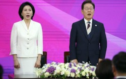 이재명 대통령 부부가 4일 서울 여의도 국회에서 열린 취임선서에 앞서 애국가를 부르고 있다. 국회사진기자단 이재명 대통령이 취임 첫날인 4일 빨강과 파랑이 배색된 넥타이를 매고 취임 선서를 했다. 푸른색은 더불어민주당, 붉은색은 국민의힘의 상징색으로 통합 의지를 …