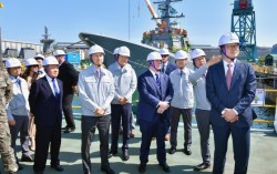 정기선 HD현대 수석부회장이 존 펠란 미 해군성 장관과 함께 HD현대중공업 특수선 야드를 둘러보며 건조 중인 함정들을 소개하고 있다. 사진 HD현대 HD현대중공업과 한화오션 대표가 아시아태평양경제협력체(APEC) 통상장관회의를 위해 제주를 방한한 제이미슨…