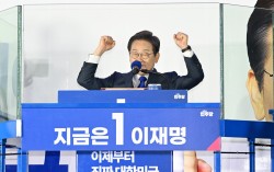 제21대 대통령 당선이 확실시되는 이재명 더불어민주당 대통령 후보 4일 서울 여의도 국회 앞에 마련된 더불어민주당의 국민개표방송시청 현장에서 지지자들에게 감사 인사를 하고있다. 김성룡 기자 제21대 대통령선거의 개표가 완료됐다. 이재명 대통령 당선인은 최…